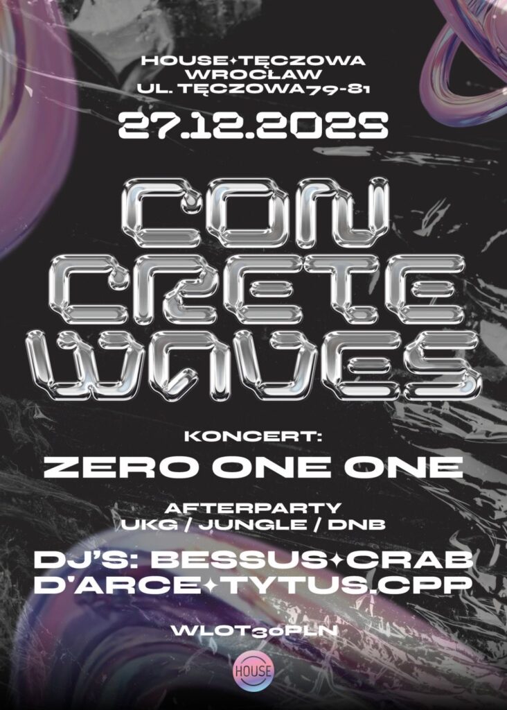 Concrete Waves – Koncert + Afterparty , 27 grudnia 1904 w Londynie miała miejsce teatralna premiera Piotrusia Pana. Idąc tym tropem i hołdując jego podstawowym wartościom tj. zabawie, przygodzie i spontaniczności – zapraszamy Was na party, które będzie idealnym miejscem aby na kilka godzin oderwać się od smutków, odpowiedzialności i wszechobecnej nudy towarzyszącej dorosłości. ZERO ONE ONE To wrocławskie improwizacyjne techno trio, które nieustannie bada granice wykonywania elektronicznej muzyki na żywo. Ich surowe brzmienie kształtowane jest przez doświadczenia członków: Pawła, klasycznie wykształconego wirtuoza na klawiszach; Klaudii, charyzmatycznej performerki z ASP na wokalu; oraz Andrew, weterana branży muzycznej na syntezatorach modularnych. Znani z hipnotycznych nagrań realizowanych ‘na setkę’ w studio Wave on Wave w centrum Wrocławia, Zero One One integruje swoje improwizowane sety ze sztukami wizualnymi, występując nie tylko na festiwalach muzycznych, ale również w przestrzeniach galerii. Ich muzyka to osobliwa, taneczna podróż, w której zdarzają się zarówno bieżnie, jak i fortepiany. Po koncercie afterparty w klimatach UK Garage, Bass, Jungle, DnB Zagrają dobrze znani z Wrocławskiej sceny Dje i Djka : D’arce Bessus Crab tytus.cpp 27.12.2025 Wrocław HOUSE Tęczowa imprezy dnbjunglekoncerttechnoukgarage